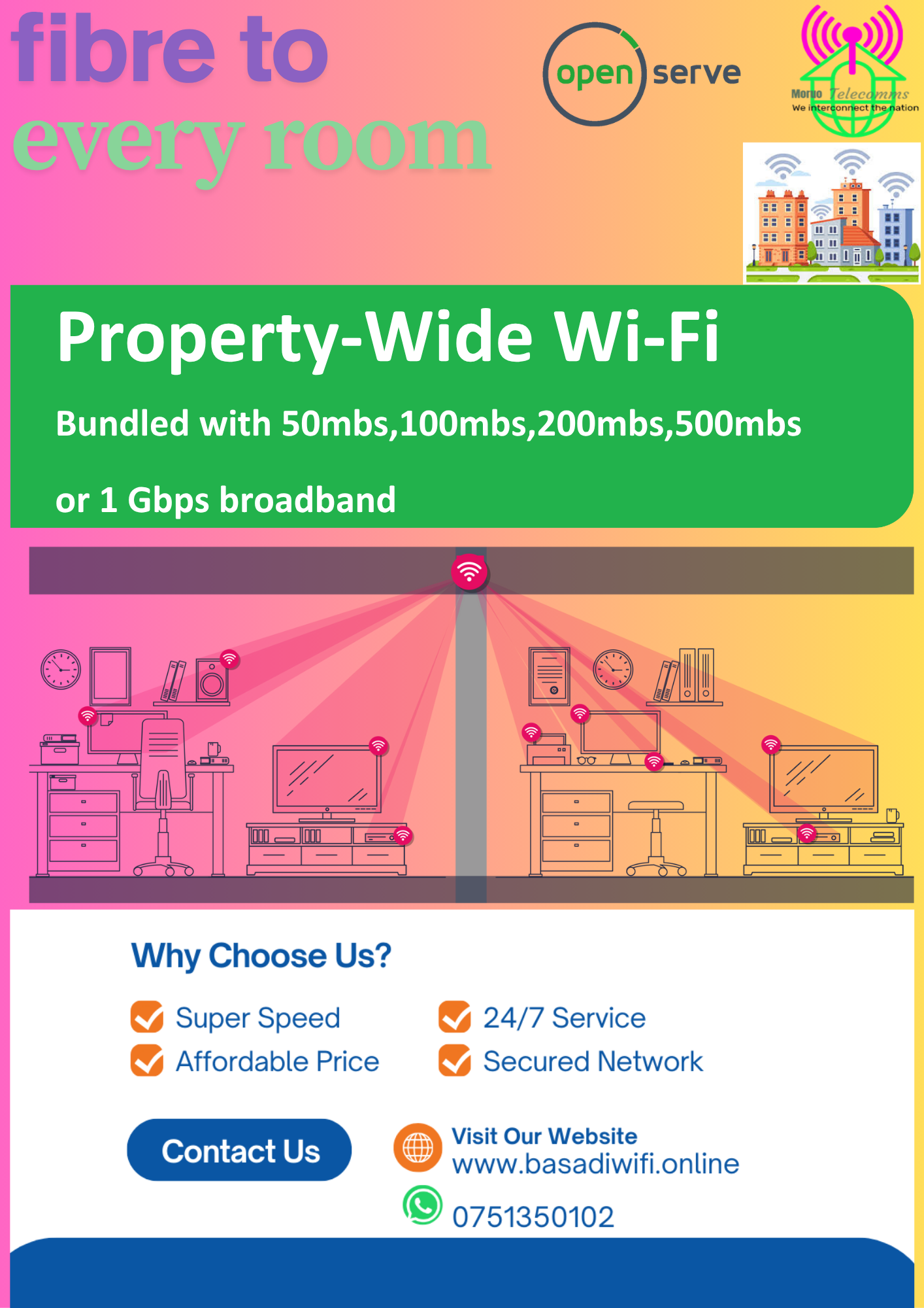 Moruo Telecomms Support (for Openserve Fibre): If you're using Openserve's fibre service through free trial, you can reach Moruo Telecomms on WhatsApp 0751350102, including email at openserve@basadiwifi.online.